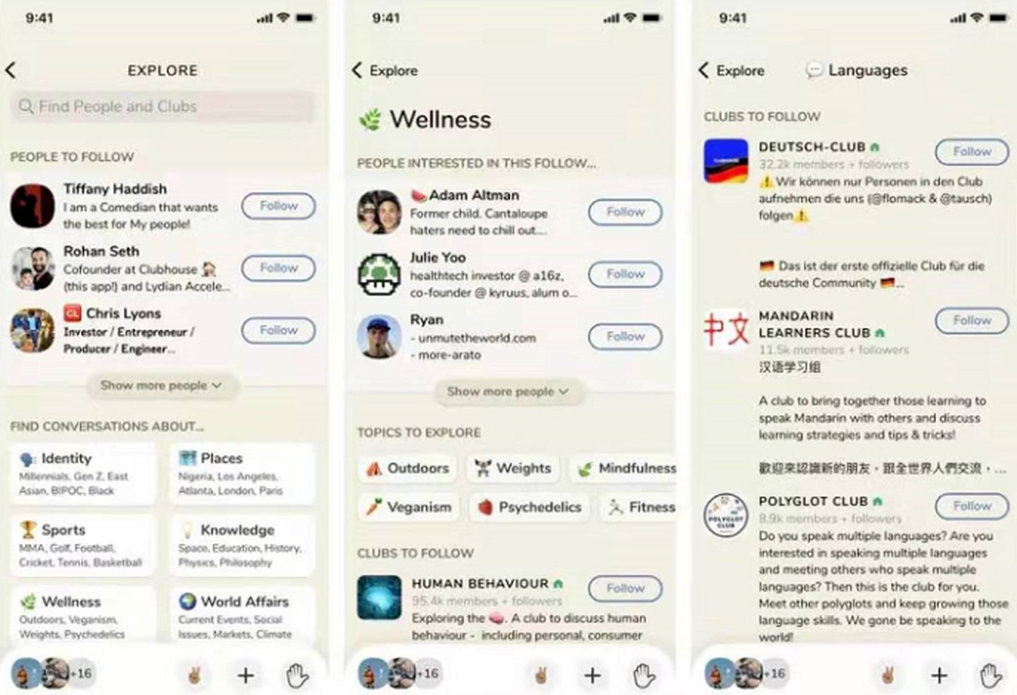 Clubhouse cũng mang đến cho người dùng cơ hội khám phá những người bạn và khu vực mới. Sau khi tham gia Clubhouse, hệ thống sẽ mời bạn theo dõi các câu lạc bộ khác nhau dựa trên sở thích cá nhân của bạn, liên quan đến nhiều lĩnh vực khác nhau. Các câu lạc bộ này sẽ tổ chức các buổi giao lưu trực tuyến khác nhau theo thời gian, và bạn có thể tham gia.